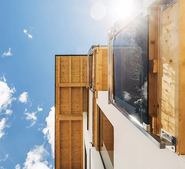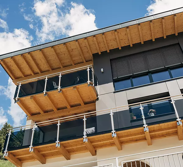 Eine Fassadenkombination aus Putzfassade und Max Exterior Platten wurden bei diesem Ausbau in Riegelbauweise verwendet. Der Sichtdachstuhl ist pultdachförmig mit Bitumendach-Eindeckung. Die Holz-Alu Fenster wurden mit Sonnenschutz und Raffstoren ausgestattet. Die Balkonbrüstung aus Edelstahl und Sicherheitsglas gefertigt. Ebenso wurde ein großer Carport errichtet.