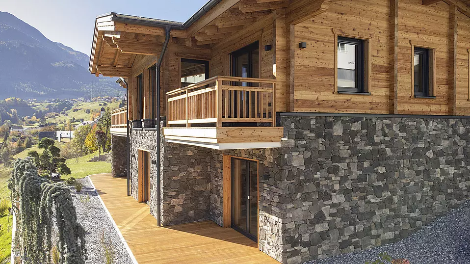Für diejenigen, die eine rustikalere Optik bevorzugen, bieten wir Fassadenkombinationen aus Holz und Stein an. Diese Kombination verleiht Ihrem Gebäude einen urigen, traditionellen Charme und sorgt gleichzeitig für eine harmonische Integration in die Umgebung.