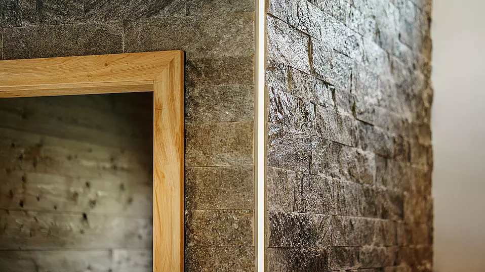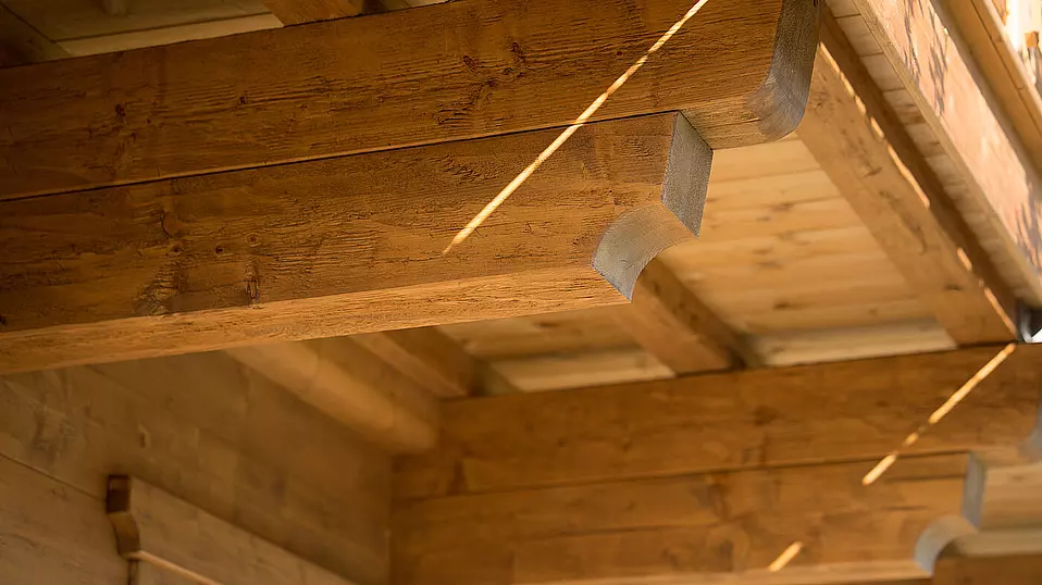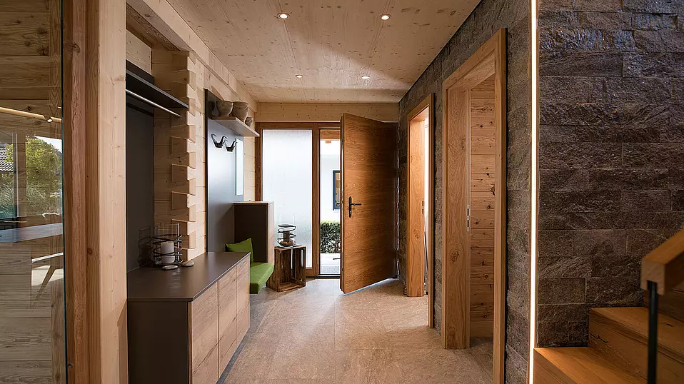 Die Verbindungen wurde bei unserem Tiroler Musterhaus das Tiroler Schloss umgesetzt. Die Fassade mit Blockbohlen in Fichte gestaltet. Für die Verkleidung der Innenwände wurden neben Blockbohlen aus Fichte gebürstet auch Schalungen aus Fichte, Zirbe, Retrotimber Lärche bzw. Gipskarton verwendet.