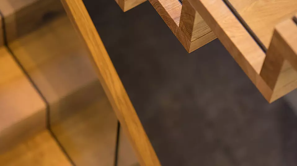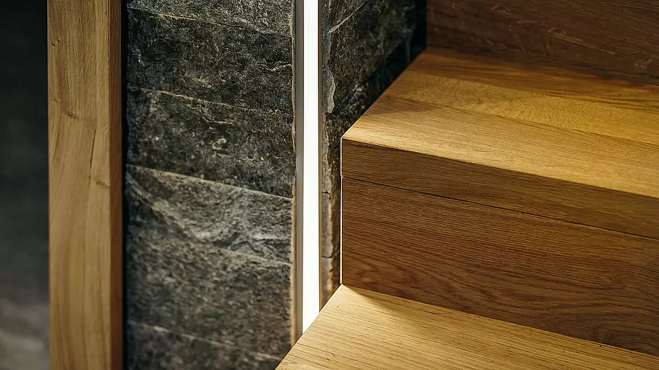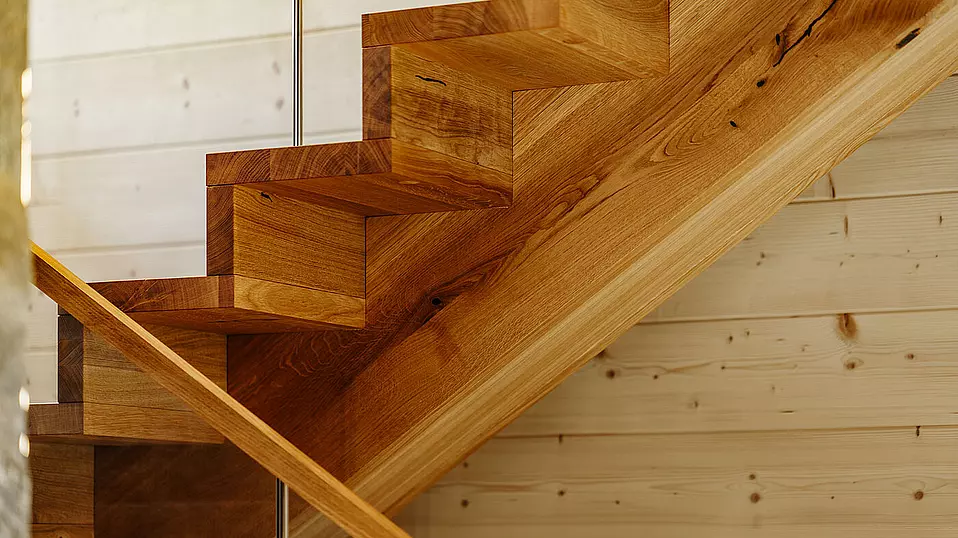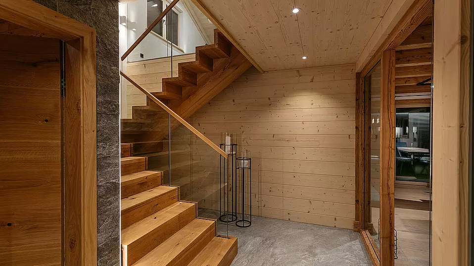 - Innentreppe: Eiche rustikal massiv, Holmtreppe mit Steig- und Brüstungsgeländer aus Sicherheitsglas