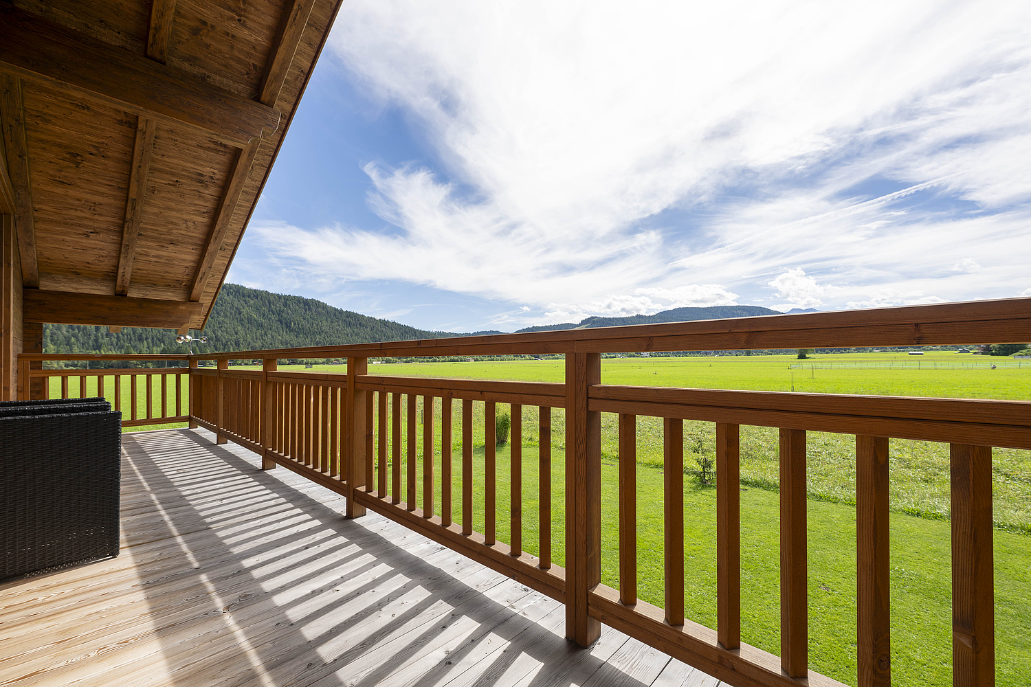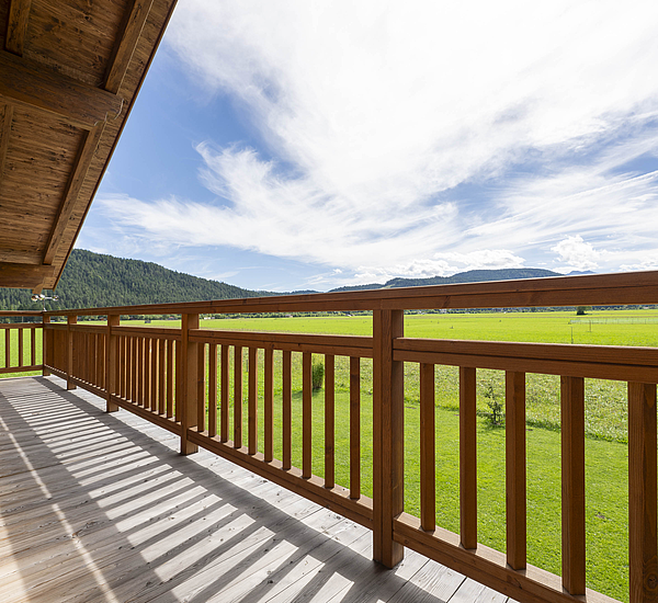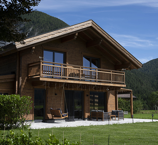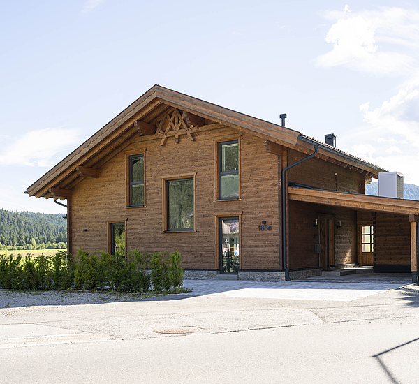 Neben seiner starken gestalterischen Wirkung überzeugt das Haus auch durch eine durchdachte technische Umsetzung. Die 120 mm starke Blockwand mit Innendämmung, das Ziegeldach, Holz-Alu-Fenster und Raffstores verbinden traditionelle Bauweise mit zeitgemäßer Funktionalität. Ergänzt durch Luft-Wärmepumpe, Keller, Garage bzw. Carport und einen Balkon aus gestrichener Fichte entstand ein Haus, das natürliches Wohnen, moderne Haustechnik und langfristige Wohnqualität in besonders stimmiger Form zusammenführt.