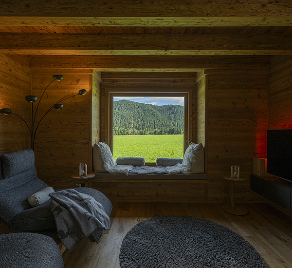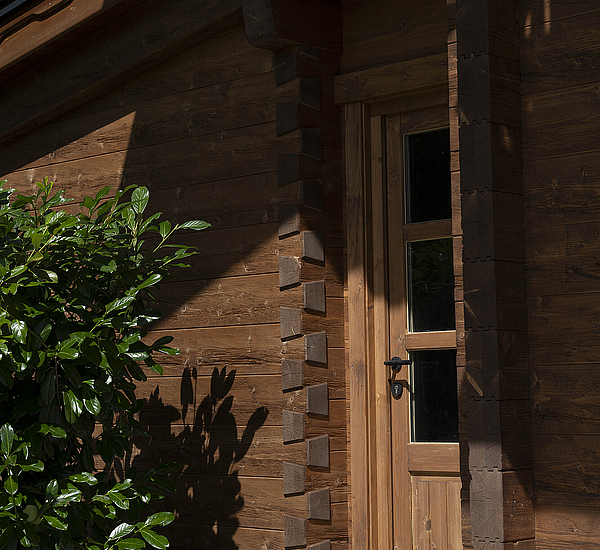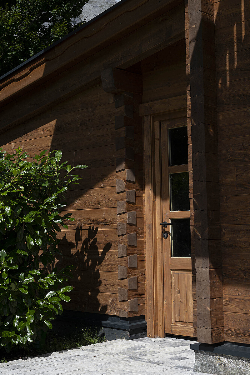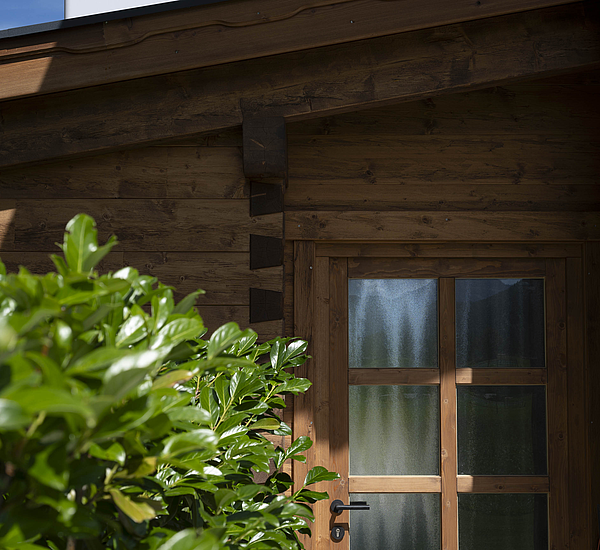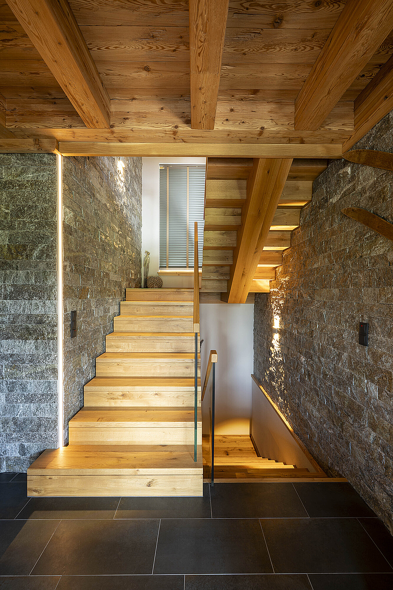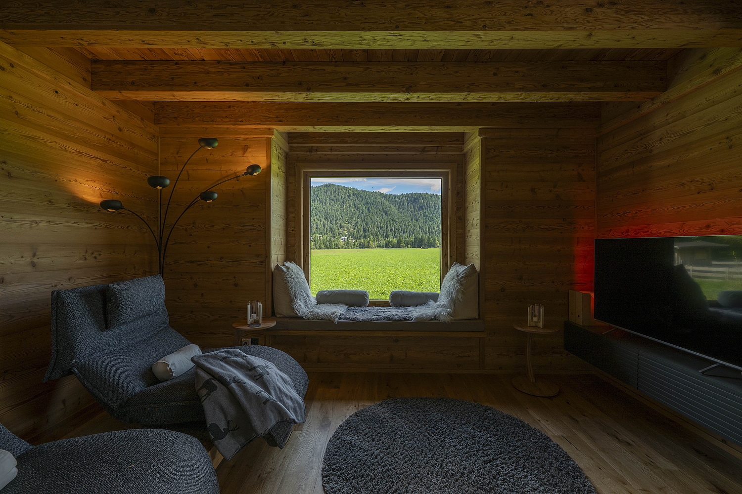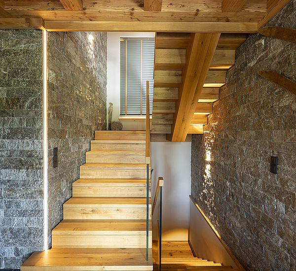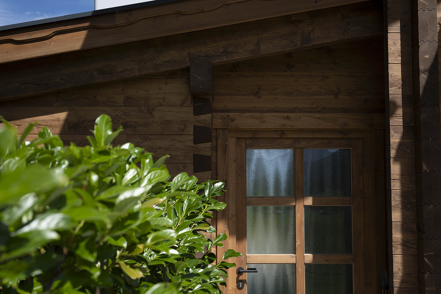 Besonders prägend ist die sorgfältig abgestimmte Materialität. Die Außenwände in Blockbauweise mit gehackter und gestrichener Fichtenoberfläche verleihen dem Haus eine markante, natürliche Präsenz, während im Innenbereich die gebürstete, naturbelassene Fichte für eine warme und authentische Wohnatmosphäre sorgt. Die Tramdecke über dem Erdgeschoss in RetroTimber Lärche, gehackt ausgeführt, bringt zusätzliche Tiefe und handwerklichen Ausdruck in das Haus. Auch die sichtbare Dachkonstruktion aus Fichte greift diesen Charakter auf und macht die hochwertige Holzbauweise im Innen- wie im Außenbereich erlebbar.
