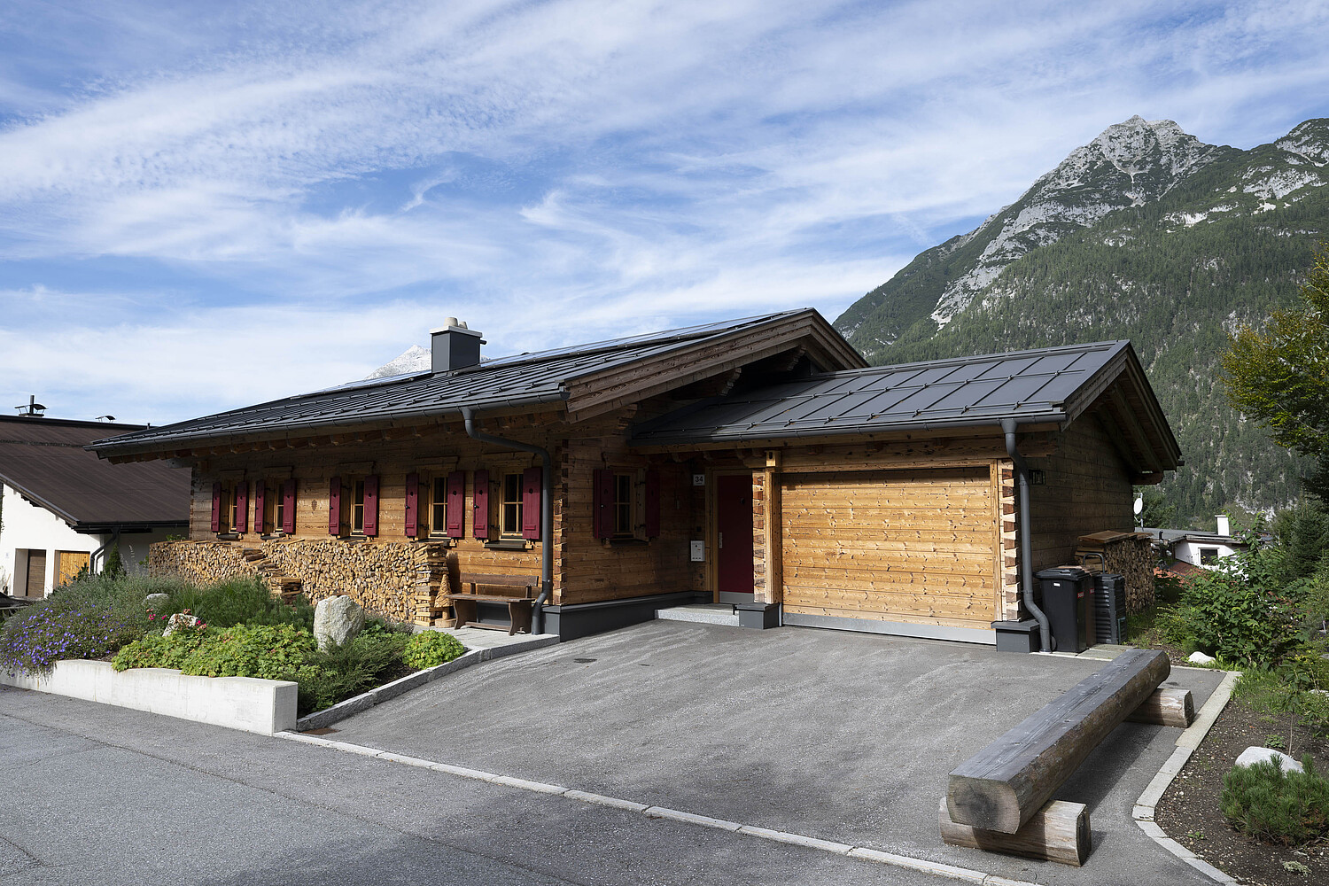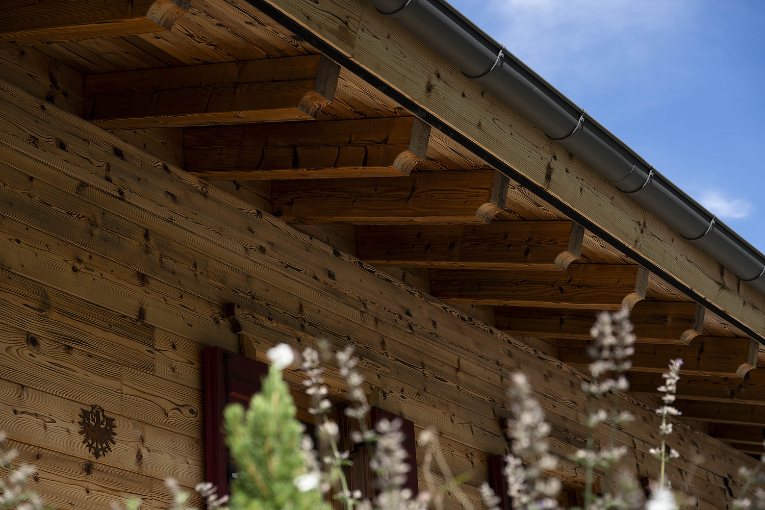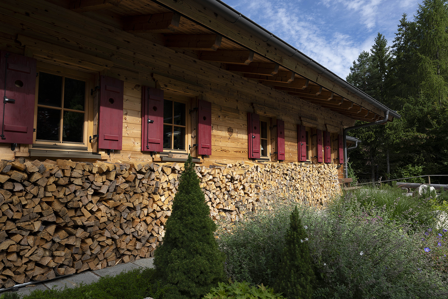 Auch konstruktiv überzeugt das Projekt durch eine durchdachte und stimmige Umsetzung. Die 120 mm starke Blockwand mit Innendämmung, die Tramdecke über dem Untergeschoss, das Blechdach sowie die Photovoltaikanlage verbinden traditionelles Bauen mit moderner Funktionalität und nachhaltiger Energieversorgung. Ergänzt durch die Garage und die präzise Einbindung in das Hanggrundstück entstand ein Wohnhaus, das handwerkliche Qualität, natürliche Ausstrahlung und langfristige Wohnqualität in besonders harmonischer Weise vereint.