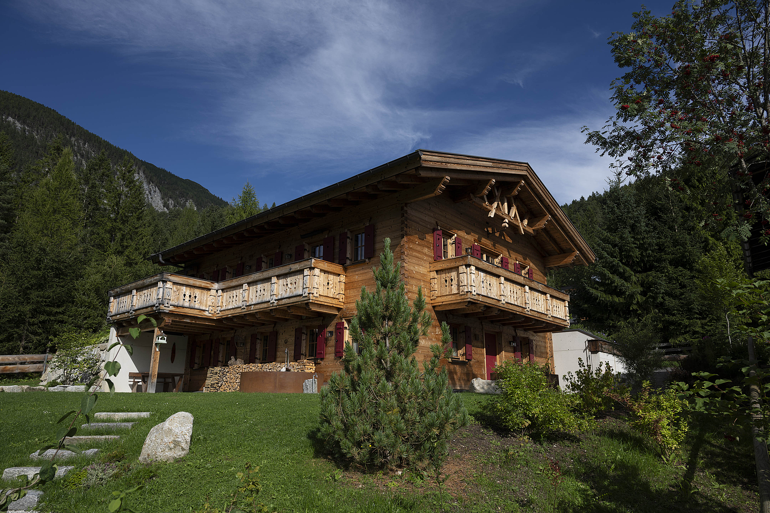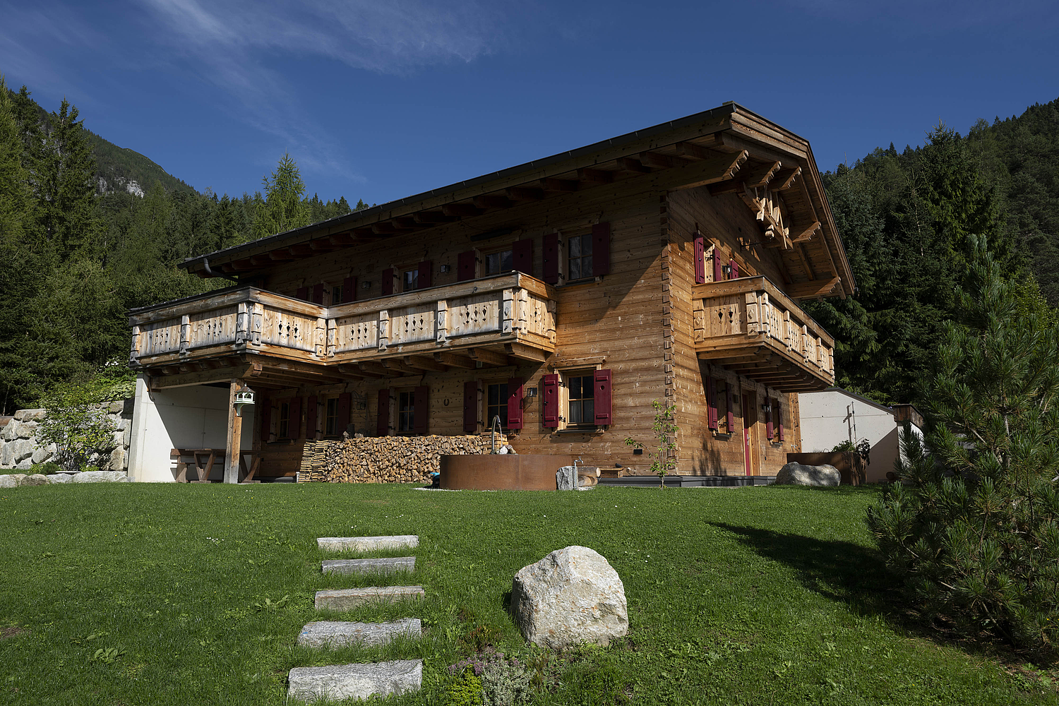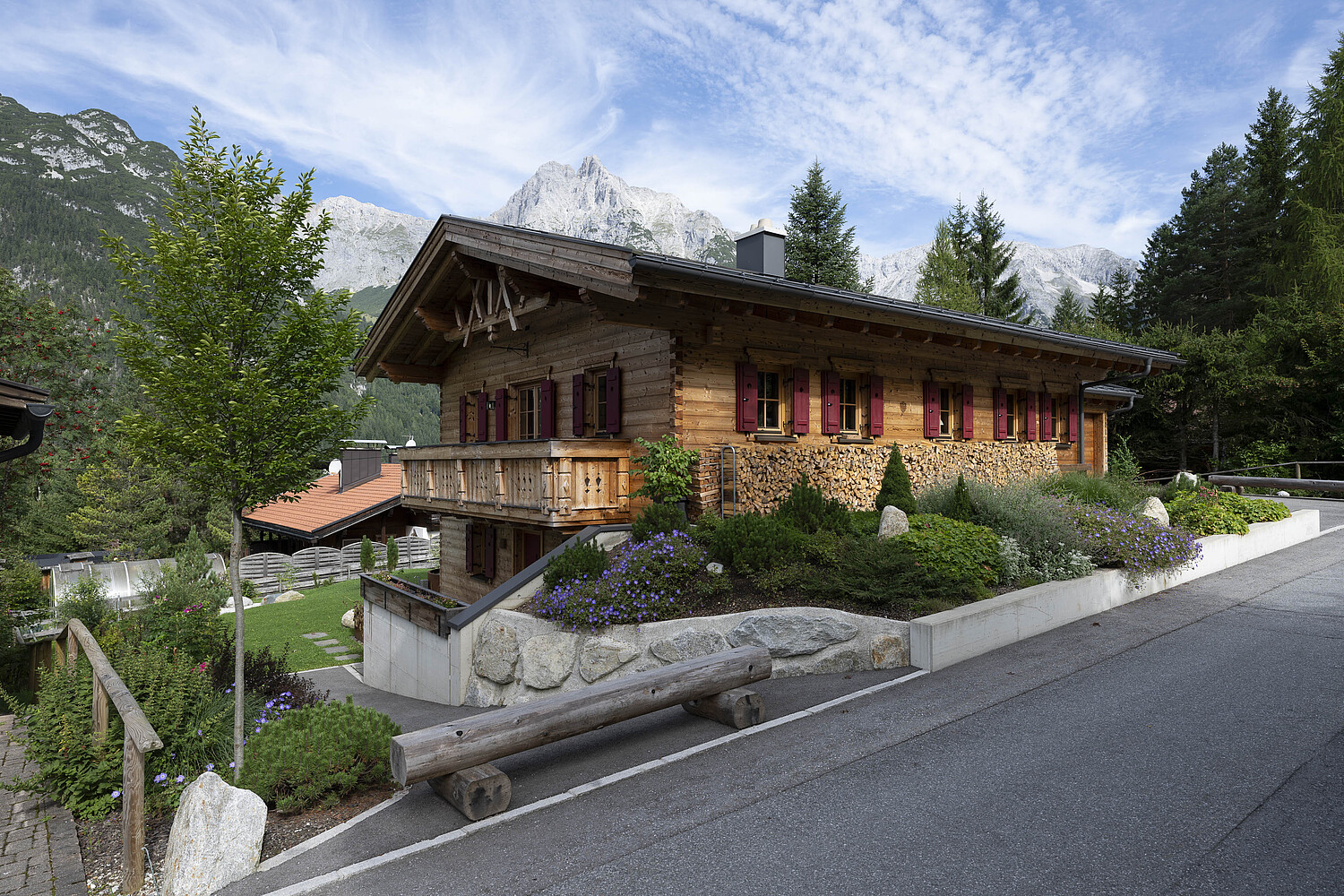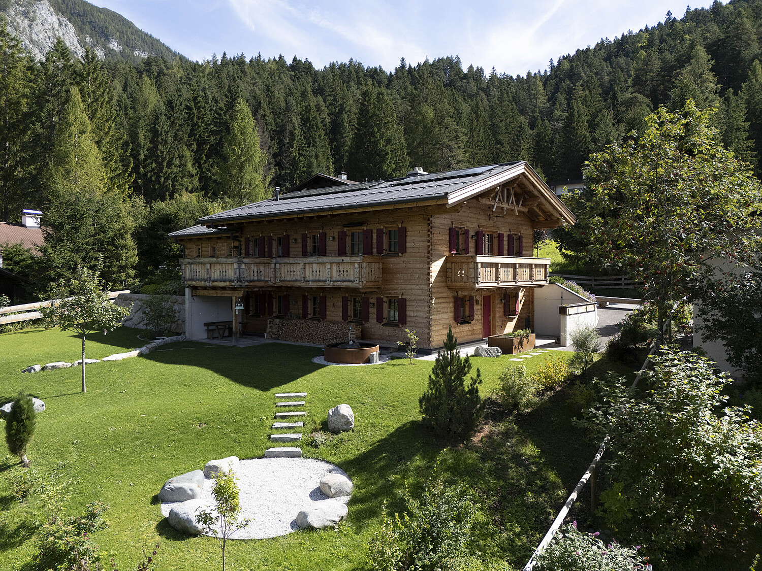 Auch konstruktiv überzeugt das Projekt durch eine durchdachte und stimmige Umsetzung. Die 120 mm starke Blockwand mit Innendämmung, die Tramdecke über dem Untergeschoss, das Blechdach sowie die Photovoltaikanlage verbinden traditionelles Bauen mit moderner Funktionalität und nachhaltiger Energieversorgung. Ergänzt durch die Garage und die präzise Einbindung in das Hanggrundstück entstand ein Wohnhaus, das handwerkliche Qualität, natürliche Ausstrahlung und langfristige Wohnqualität in besonders harmonischer Weise vereint.