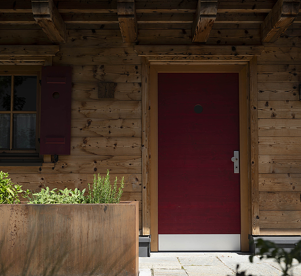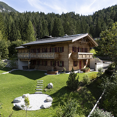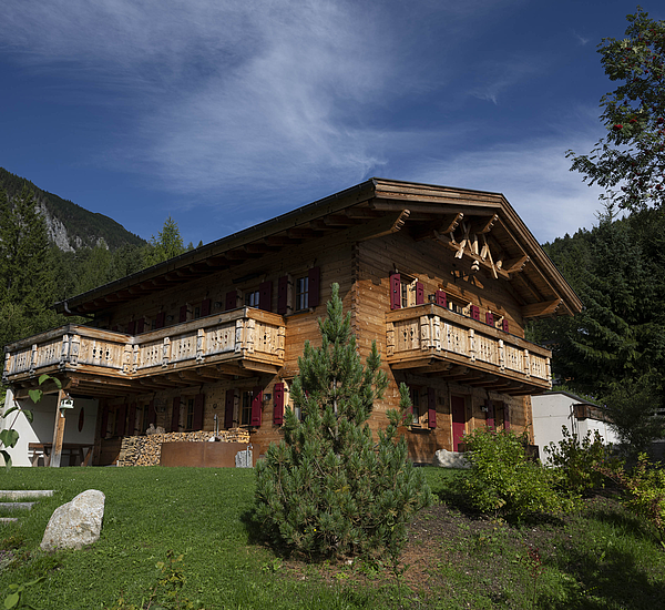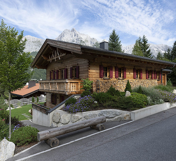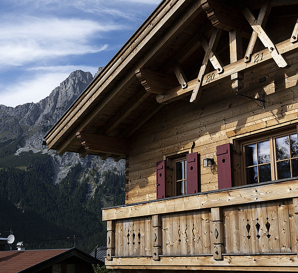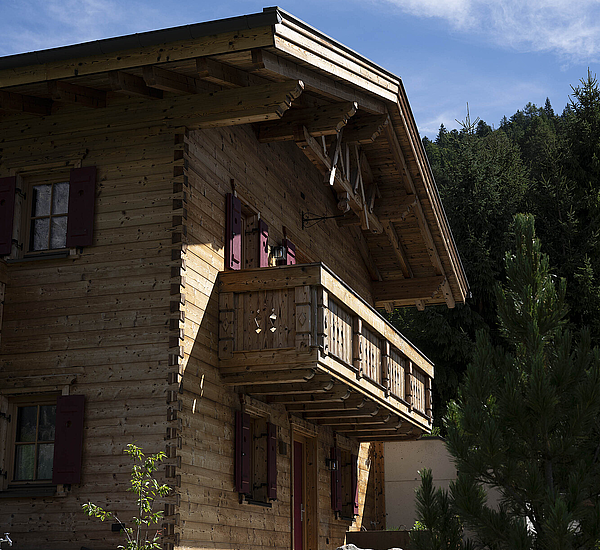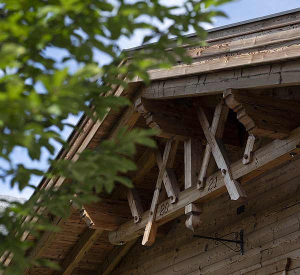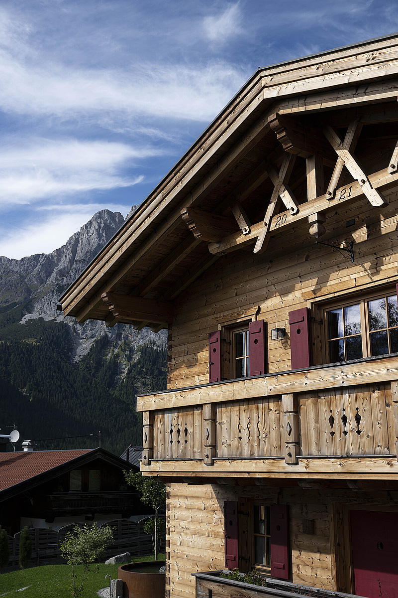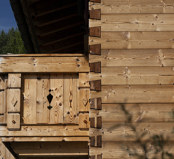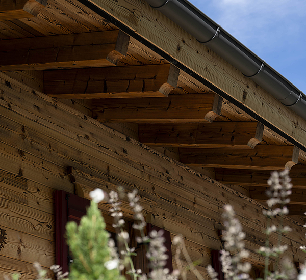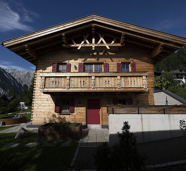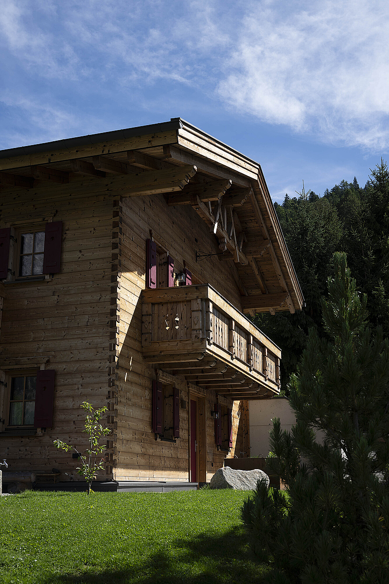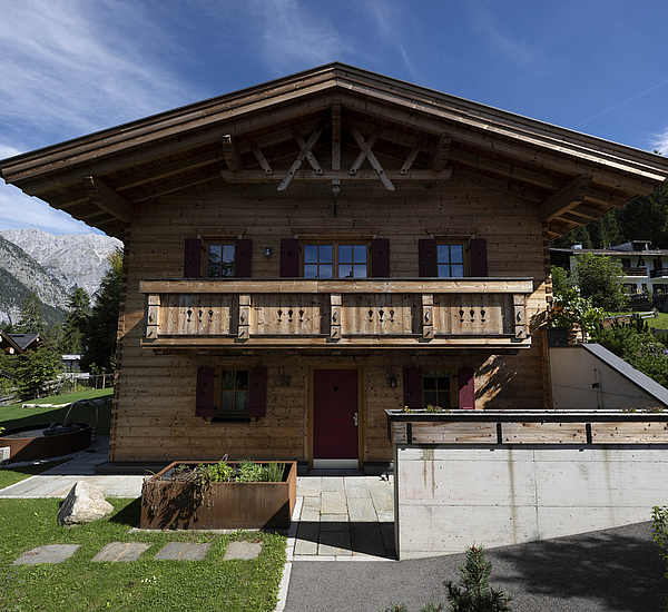 Seinen unverwechselbaren Charakter erhält das Haus durch die sorgfältig abgestimmten Details und die natürliche Materialität. Die Außenwände in Blockbauweise mit gehackter und gestrichener Fichtenoberfläche verleihen dem Gebäude eine markante, handwerklich geprägte Erscheinung, während die naturbelassenen Holzoberflächen im Innenbereich für eine ruhige und behagliche Atmosphäre sorgen. Der Ziergiebel, die Fensterläden und die klassische Formensprache unterstreichen den traditionellen Charakter des Hauses und geben ihm eine starke regionale Identität. Gleichzeitig wirkt das Gebäude keineswegs nostalgisch, sondern zeigt, wie sich alpenländische Bauweise hochwertig und zeitgemäß interpretieren lässt.