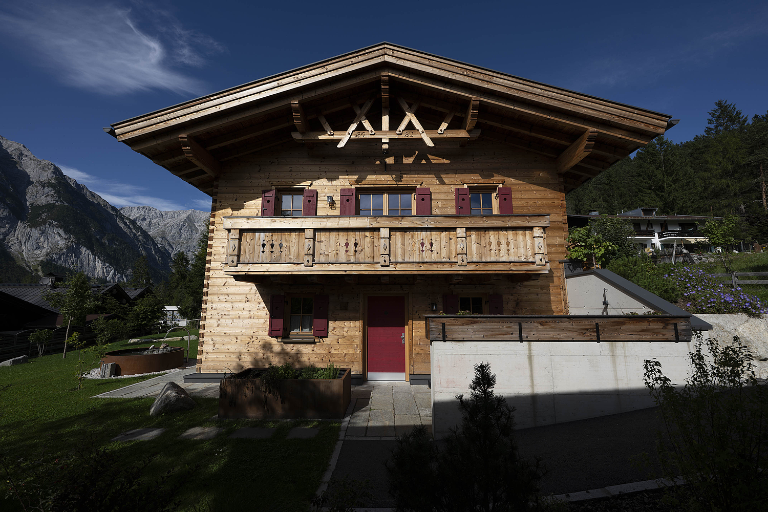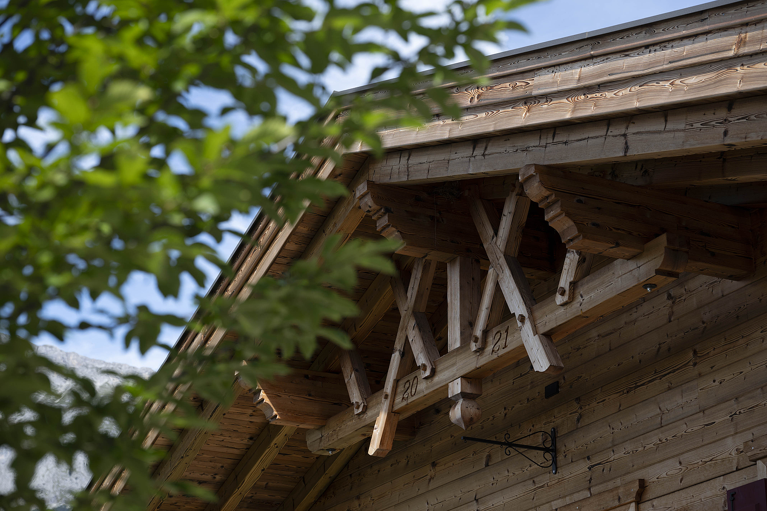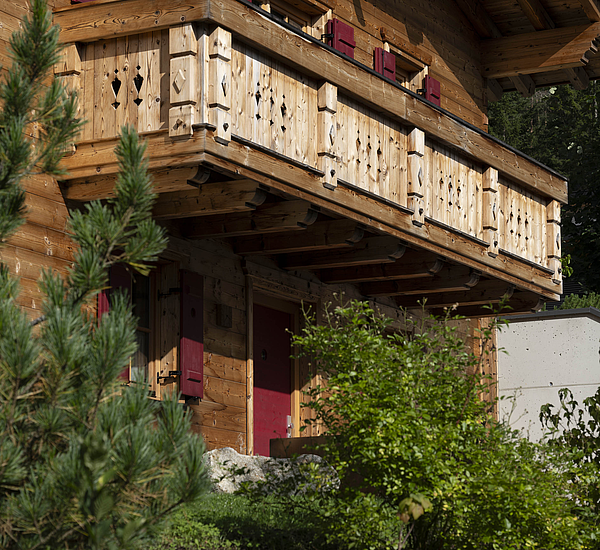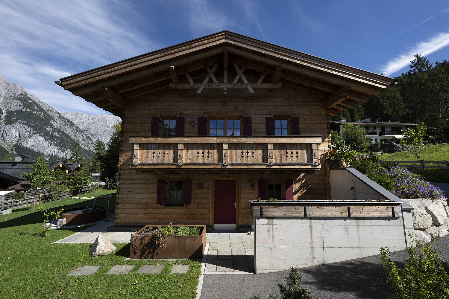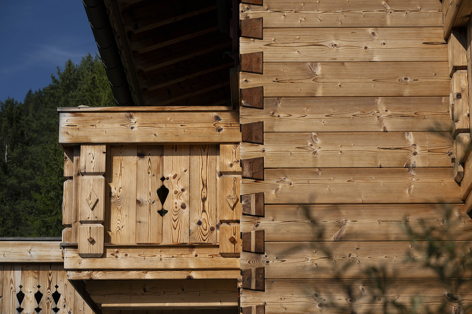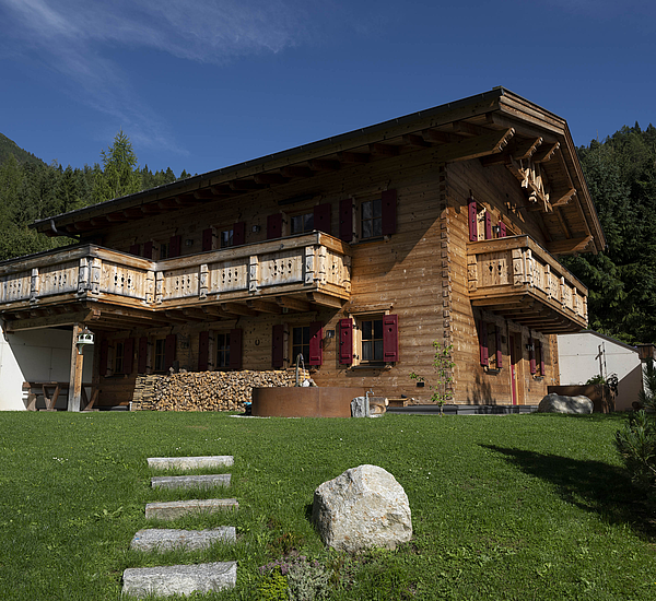 Seinen unverwechselbaren Charakter erhält das Haus durch die sorgfältig abgestimmten Details und die natürliche Materialität. Die Außenwände in Blockbauweise mit gehackter und gestrichener Fichtenoberfläche verleihen dem Gebäude eine markante, handwerklich geprägte Erscheinung, während die naturbelassenen Holzoberflächen im Innenbereich für eine ruhige und behagliche Atmosphäre sorgen. Der Ziergiebel, die Fensterläden und die klassische Formensprache unterstreichen den traditionellen Charakter des Hauses und geben ihm eine starke regionale Identität. Gleichzeitig wirkt das Gebäude keineswegs nostalgisch, sondern zeigt, wie sich alpenländische Bauweise hochwertig und zeitgemäß interpretieren lässt.