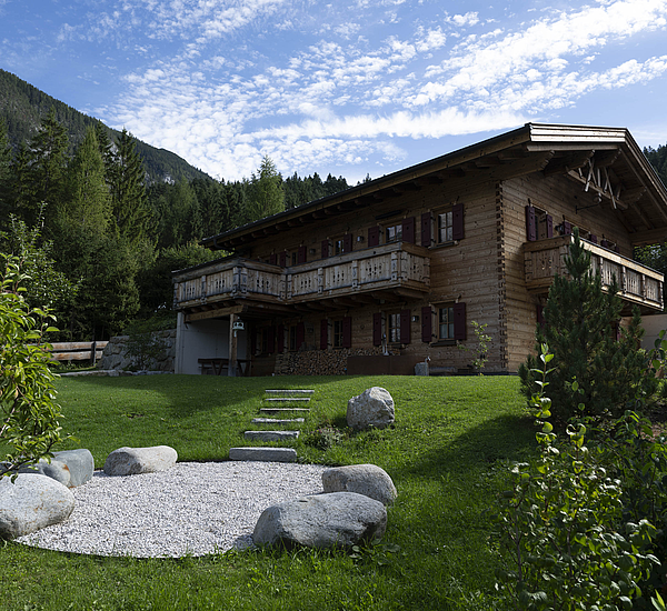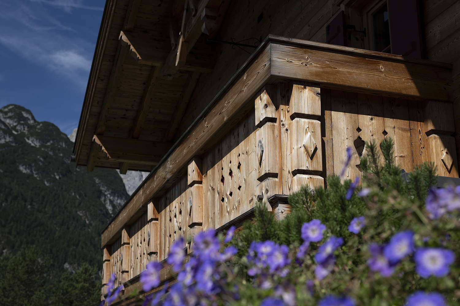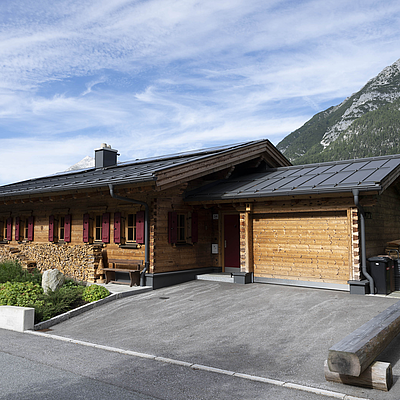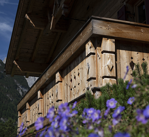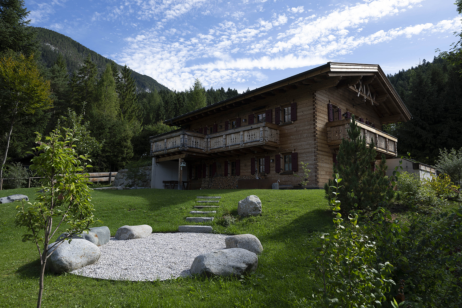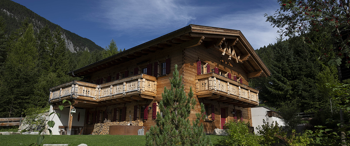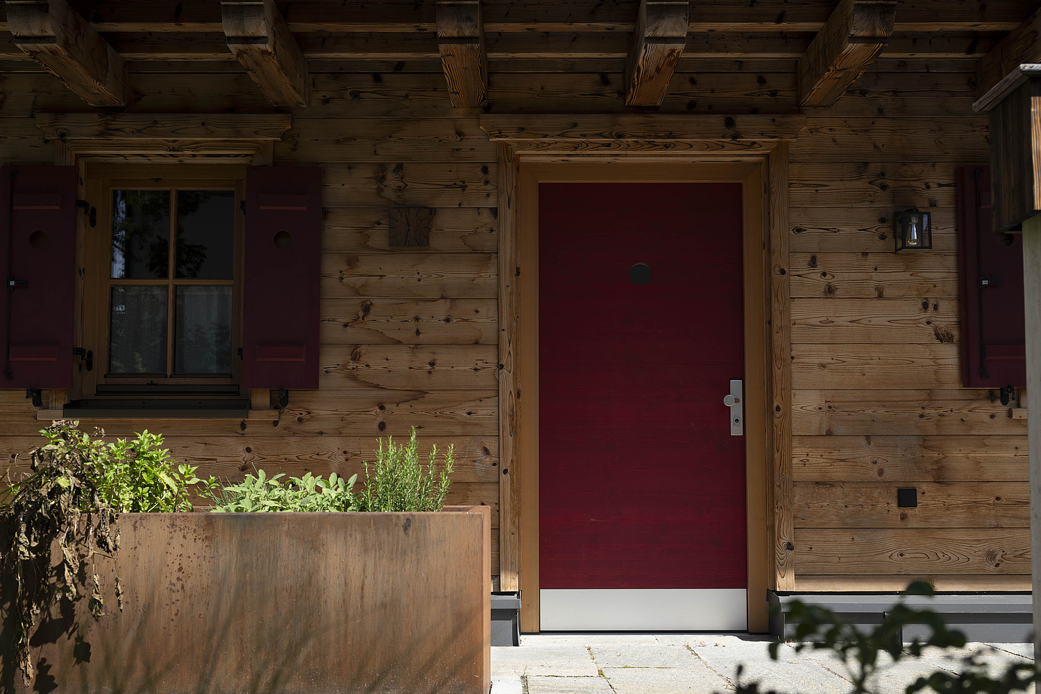 Seinen unverwechselbaren Charakter erhält das Haus durch die sorgfältig abgestimmten Details und die natürliche Materialität. Die Außenwände in Blockbauweise mit gehackter und gestrichener Fichtenoberfläche verleihen dem Gebäude eine markante, handwerklich geprägte Erscheinung, während die naturbelassenen Holzoberflächen im Innenbereich für eine ruhige und behagliche Atmosphäre sorgen. Der Ziergiebel, die Fensterläden und die klassische Formensprache unterstreichen den traditionellen Charakter des Hauses und geben ihm eine starke regionale Identität. Gleichzeitig wirkt das Gebäude keineswegs nostalgisch, sondern zeigt, wie sich alpenländische Bauweise hochwertig und zeitgemäß interpretieren lässt.