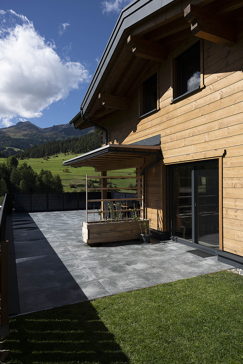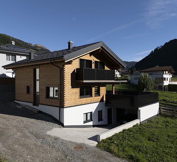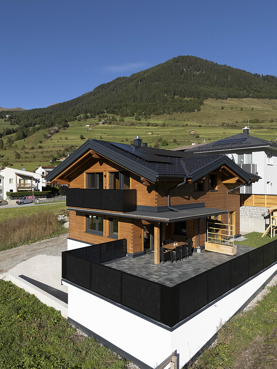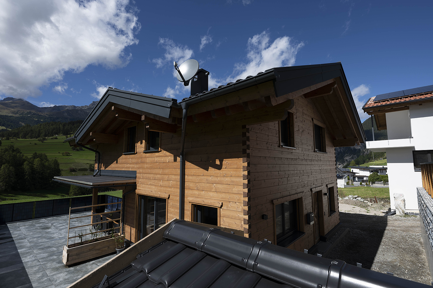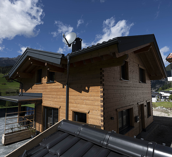 Auch konstruktiv zeigt das Projekt die Stärke eines zeitgemäß interpretierten Blockhauses. Die 120 mm starke Außenwand mit Innendämmung verbindet traditionelle Bauweise mit modernen Anforderungen an Komfort und Energieeffizienz. Das Ziegeldach fügt sich stimmig in die Gesamtarchitektur ein und unterstreicht den wertigen, dauerhaft angelegten Charakter des Hauses. So entstand ein Einfamilienhaus, das natürliche Materialien, handwerkliche Qualität und eine klare architektonische Haltung zu einem Zuhause mit echter Beständigkeit zusammenführt.