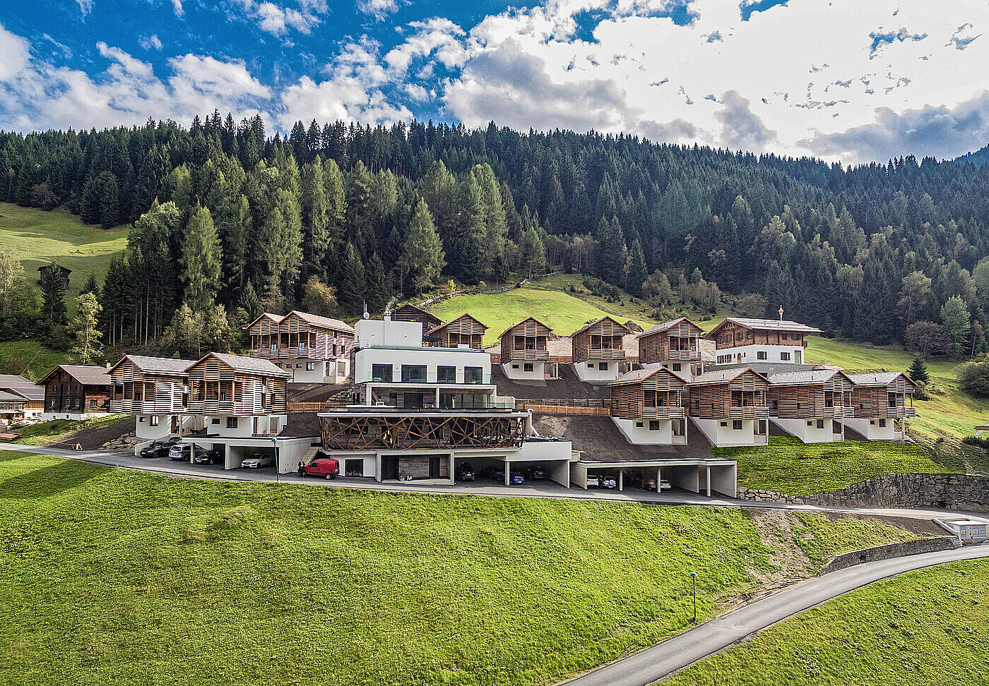 In See im Paznauntal wurden in der Architektur eines traditionellen Stadls insgesamt 13 hochwertige Chalets mit je drei Etagen errichtet. Die Oberfläche ist eine Holzfassade in Fichte bebrannt und das Holz der Fassade aus 1/4 Stamm gefertigt. Die Ferienhäuser in Riegelbauweise sind auch durch das Satteldach und die Dacheindeckung mit Lärchenschindeln ein Blickfang.