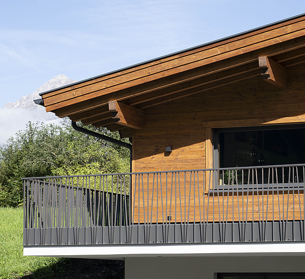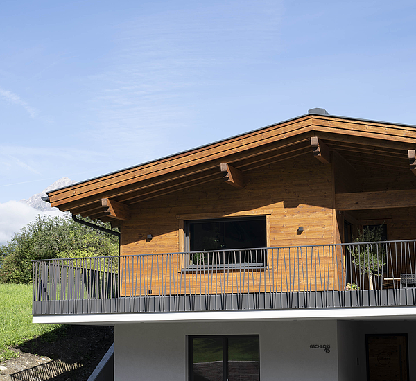 Besonders prägend ist die warme Holzfassade aus Fichte in Nut-und-Feder-Schalung, gehackt und gestrichen. Sie verleiht dem Haus eine markante, handwerklich hochwertige Anmutung und unterstreicht den natürlichen Charakter des Gebäudes. Zusammen mit dem Sichtdachstuhl, den klar proportionierten Baukörpern und der großen Terrasse entsteht eine Architektur, die gleichermaßen Schutz, Offenheit und Wohnqualität ausstrahlt. Das Haus wirkt einladend und kraftvoll – ein Ort, an dem sich Innen und Außen auf harmonische Weise begegnen.