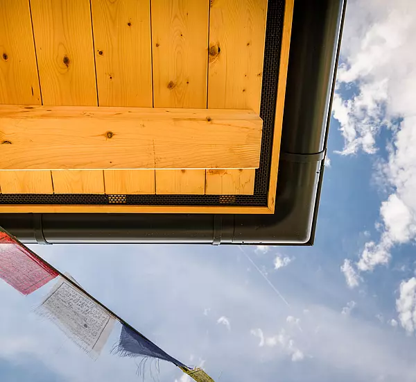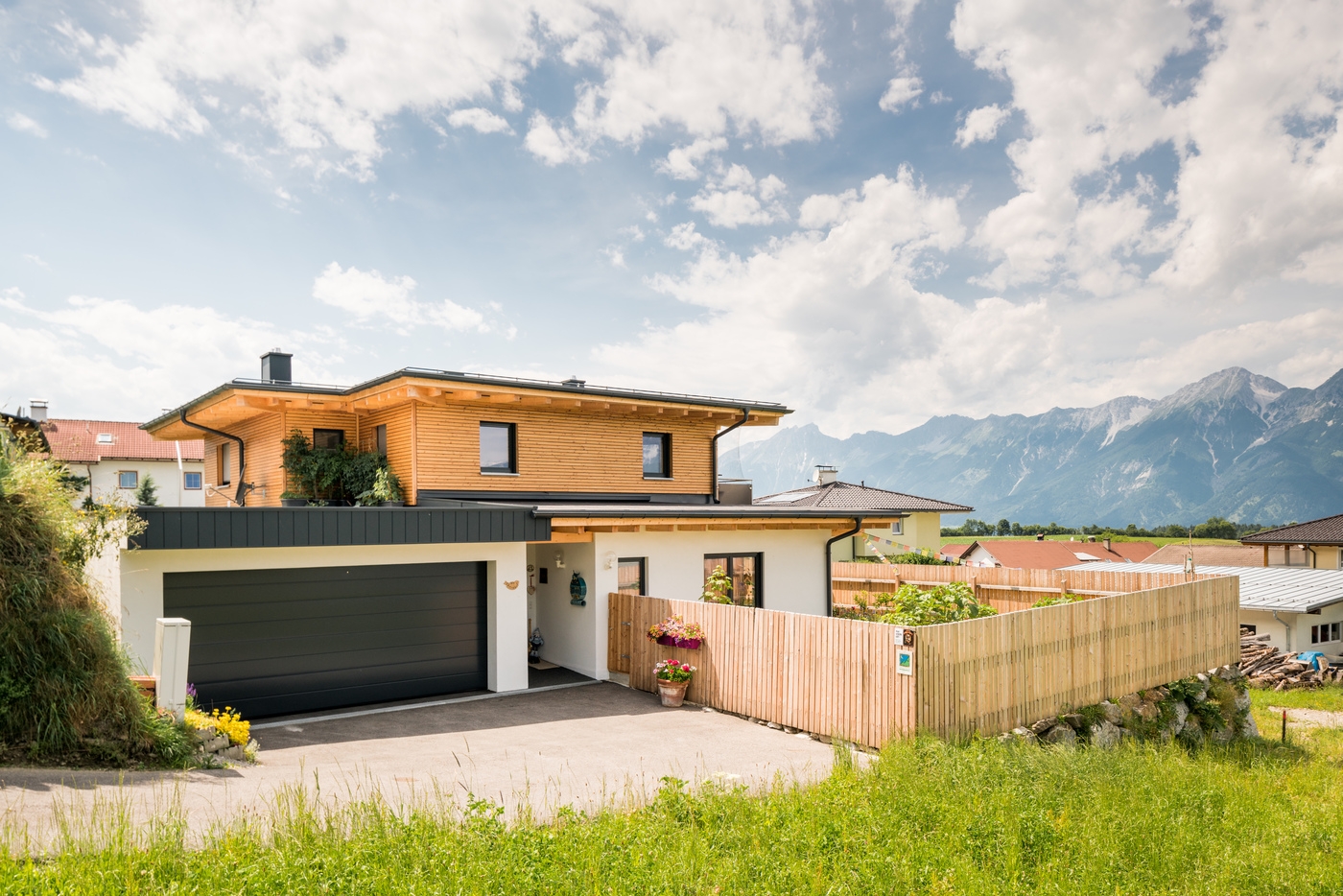 Ein modernes Riegelhaus mit Putzfassade im Eerdgeschoß und Lärchenfassade im Obergeschoß und Fenstern aus Holz-Alu mit Sonnenschutz, Raffstore und Rollo. Das Dach ist eine Walmdachkonstrukton mit Dacheindeckung aus Bitumen.