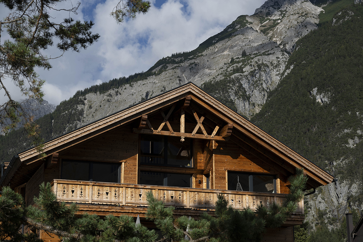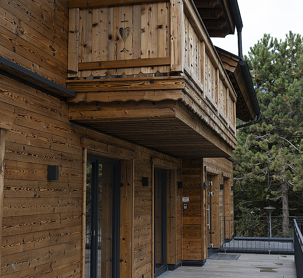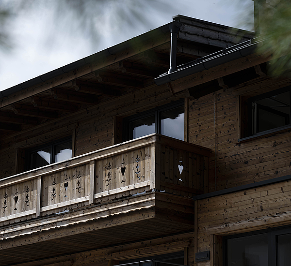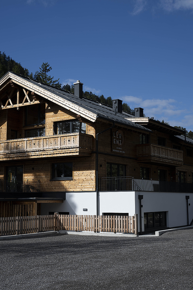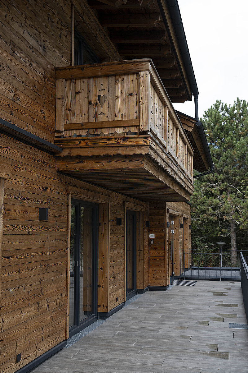 Die Gestaltung lebt vom spannenden Zusammenspiel aus solider Basis und warmem Holzcharakter. Das unterste Geschoss in Stahlbetonbauweise mit Putzfassade verankert das Gebäude klar im Bestand, während die beiden oberen Ebenen in Riegelbauweise mit gebrannter Fichtenfassade eine markante und zugleich hochwertige Identität schaffen. So entsteht ein Baukörper, der Präsenz zeigt und dennoch selbstverständlich in seine Umgebung passt. Die Balkone aus Fichte, die feinen Zierkreuze im Giebelbereich und der sichtbare Bezug zur alpinen Bautradition verleihen dem Gebäude eine unverwechselbare Handschrift.