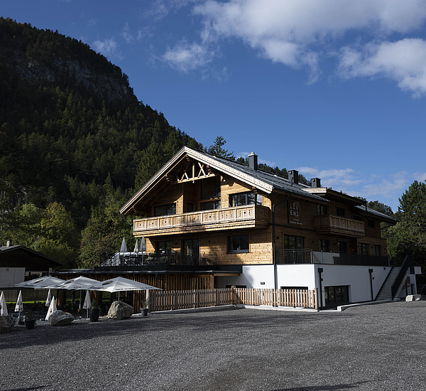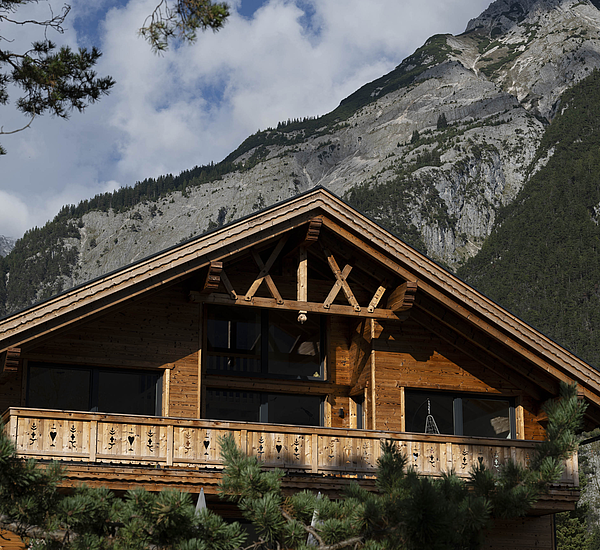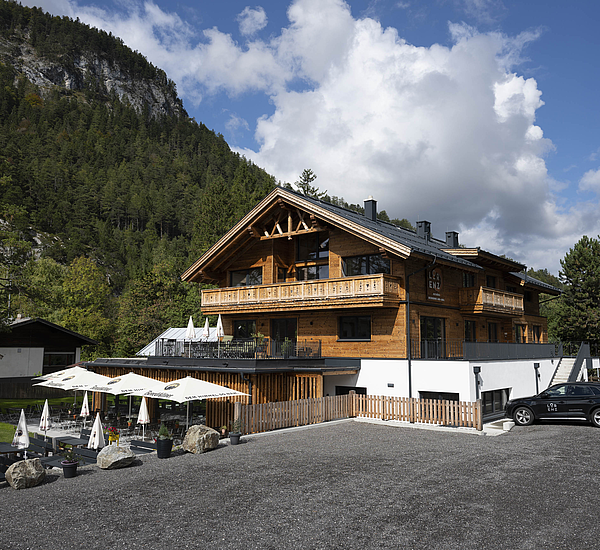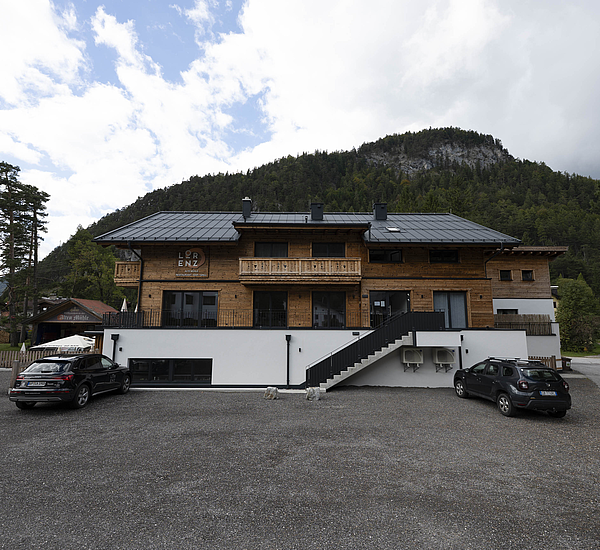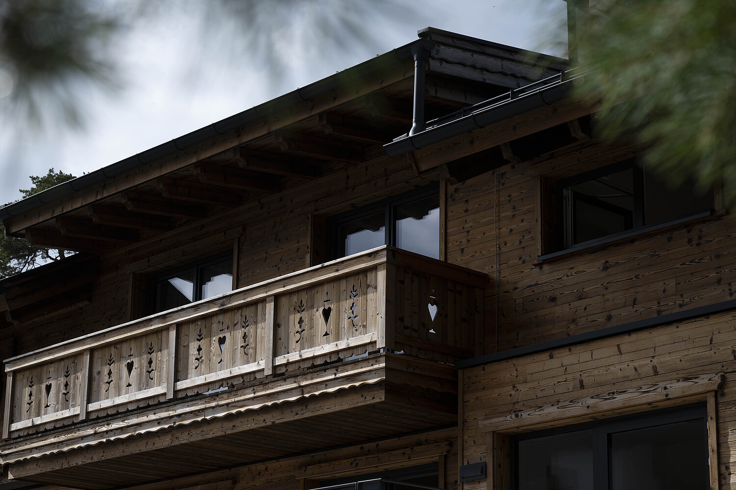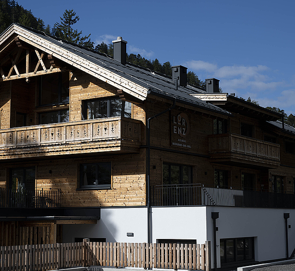 Die Gestaltung lebt vom spannenden Zusammenspiel aus solider Basis und warmem Holzcharakter. Das unterste Geschoss in Stahlbetonbauweise mit Putzfassade verankert das Gebäude klar im Bestand, während die beiden oberen Ebenen in Riegelbauweise mit gebrannter Fichtenfassade eine markante und zugleich hochwertige Identität schaffen. So entsteht ein Baukörper, der Präsenz zeigt und dennoch selbstverständlich in seine Umgebung passt. Die Balkone aus Fichte, die feinen Zierkreuze im Giebelbereich und der sichtbare Bezug zur alpinen Bautradition verleihen dem Gebäude eine unverwechselbare Handschrift.
