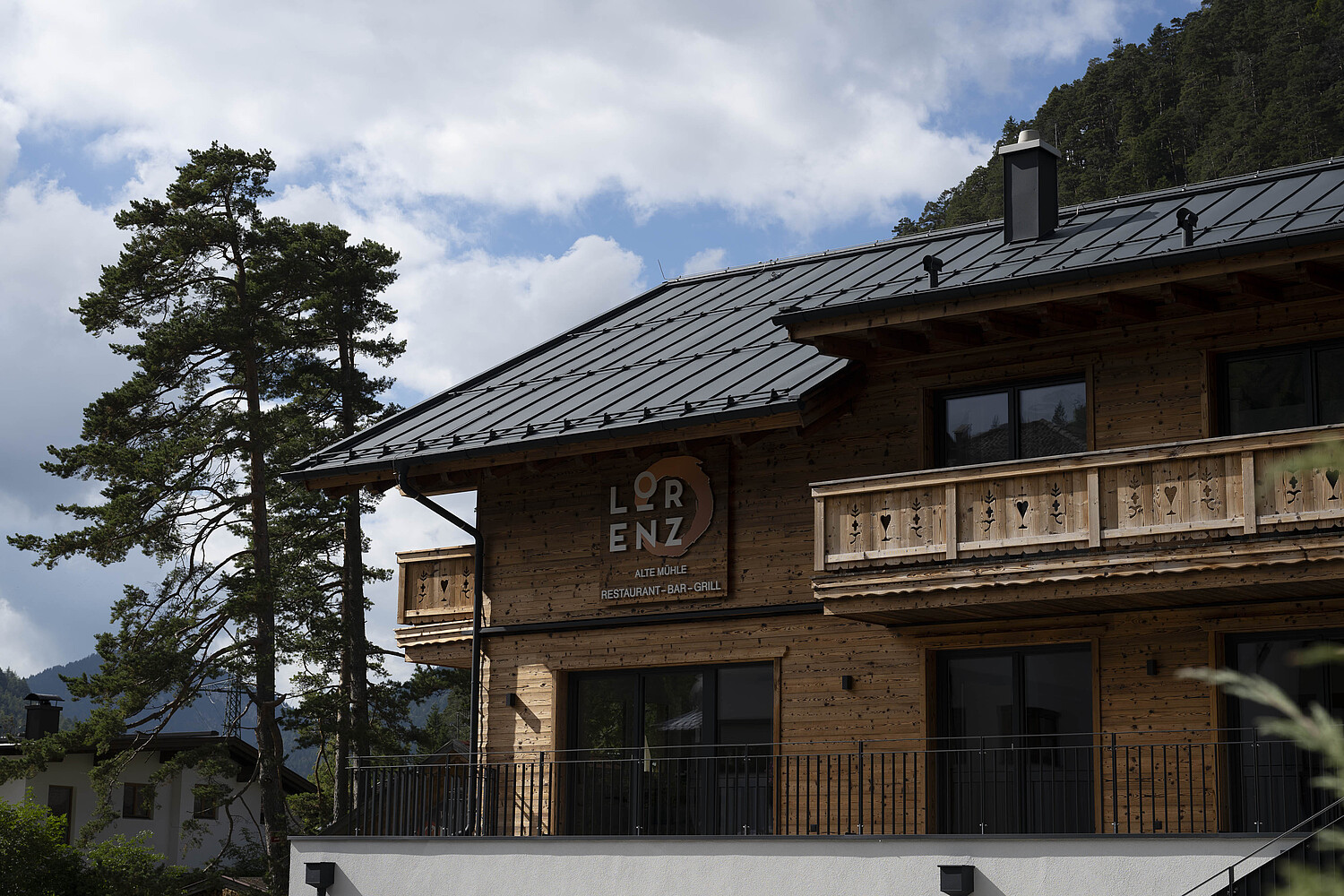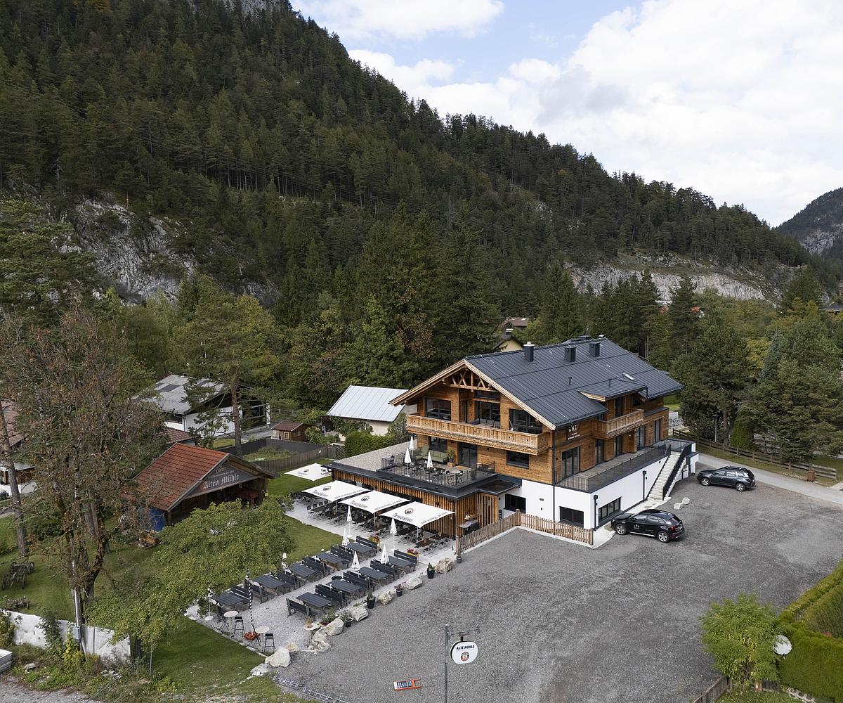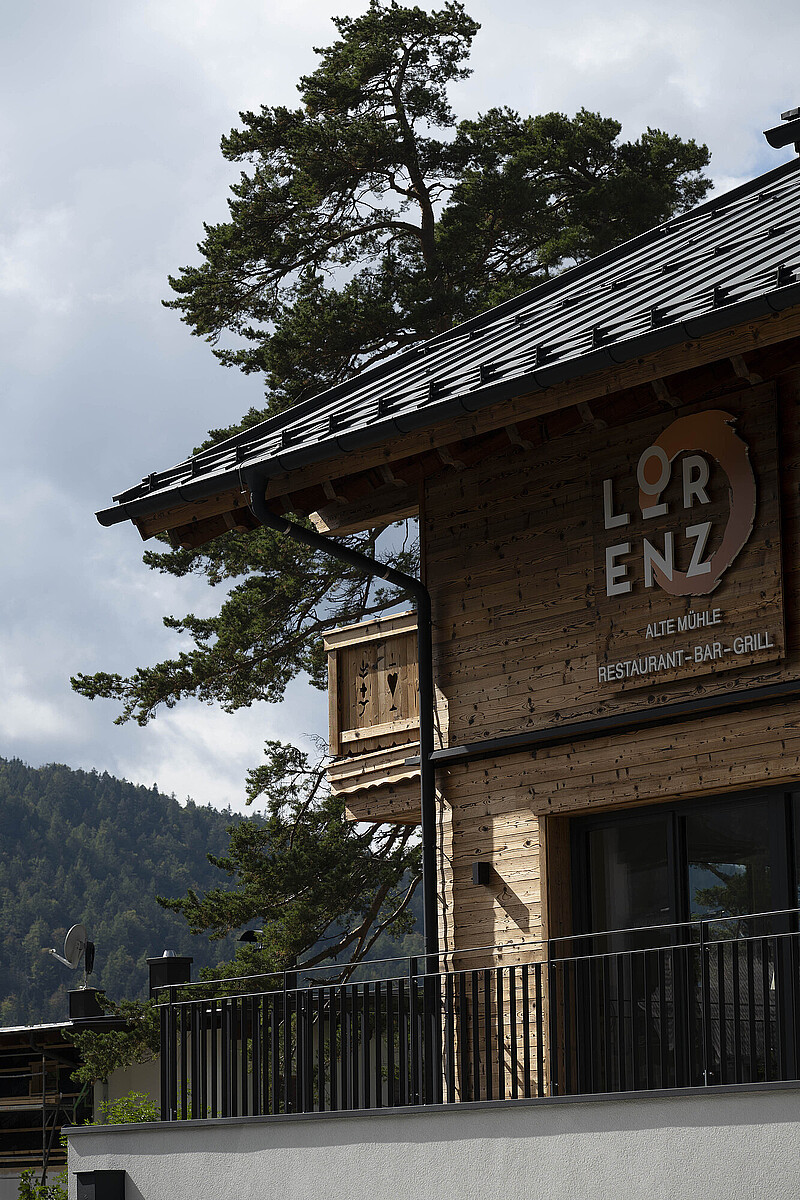 Im Inneren setzt sich dieser Anspruch konsequent fort. Die Dachkonstruktion als Sichtdachstuhl in Fichte bringt Wärme, Offenheit und handwerkliche Qualität in die Räume und schafft ein Ambiente, das für Gastronomie und Beherbergung gleichermaßen einladend wirkt. Zusammen mit dem Blechdach, der klaren Gliederung der Nutzungen und der hochwertigen Ausführung entstand mit der Alten Mühle ein Haus, das weit mehr ist als ein funktionales Tourismusprojekt: ein Ort mit Charakter, Atmosphäre und einer starken architektonischen Präsenz.