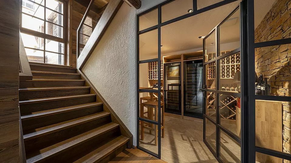 - Die Kombination aus Holzfußboden und Holzstruktur erzeugt Wärme – optisch wie physisch.